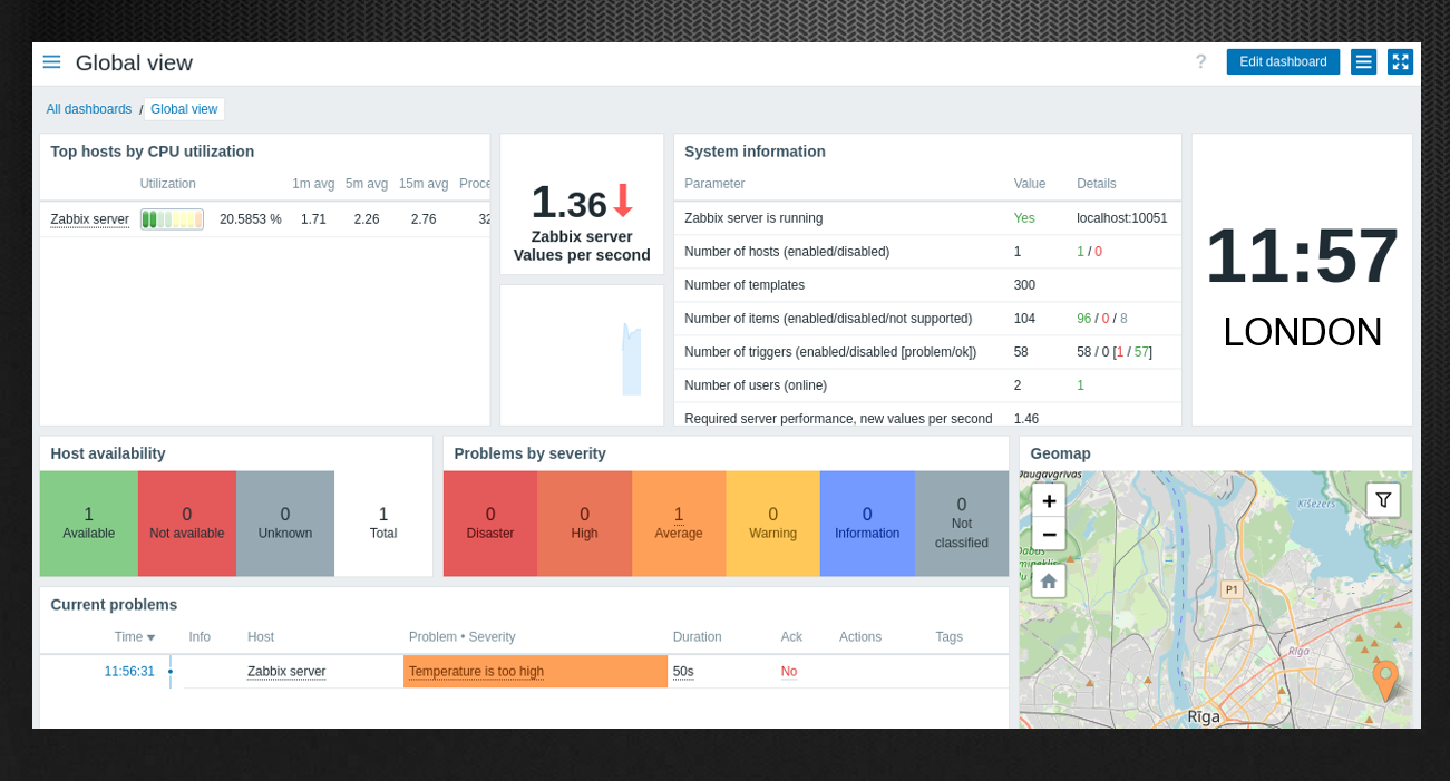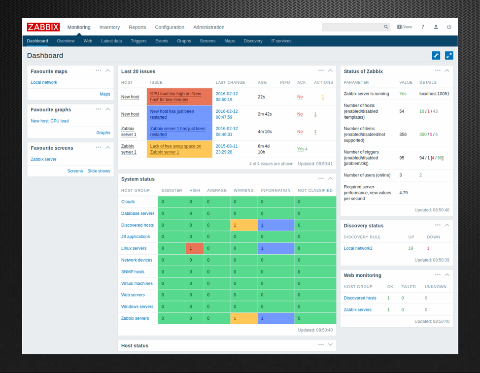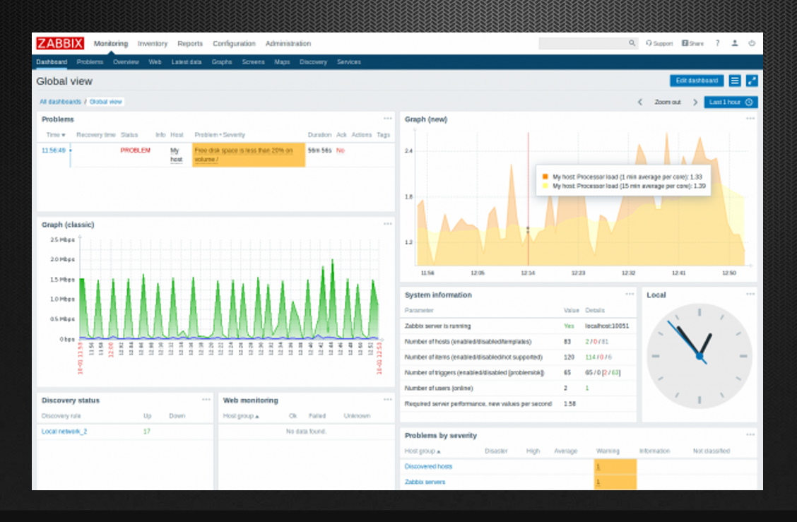 Although at the foot of this page you can see examples of the fine dashboards Zabbix provides, above all these can be fully tailored to suit your priorities and operators.